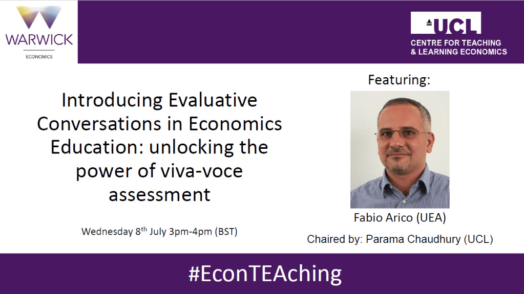 During EconTEAching Session 5, Fabio magisterially illustrated the beauty and the challenges of viva voce assessment or “evaluative conversations in Economics”. The talk was highly interactive. The audience was extremely active in asking questions and making comments. The issues of scalability, capacity, anonymity have been deeply investigated. However, before getting to this, let me explain how Fabio has implemented his evaluative conversations.
