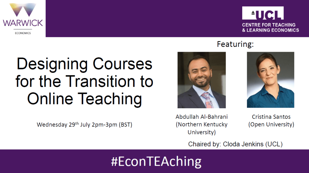The seventh session of the #EconTEAching chats organised by CTaLE and the Department of Economics at Warwick took place on 29th July 2020. It featured Dr. Abdullah Al-Bahrani (Northern Kentucky University) and Dr. Cristina Santos (Open University), and was chaired by Dr Cloda Jenkins from CTaLE at UCL. The session live-stream can be found on the CTaLE YouTube channel.