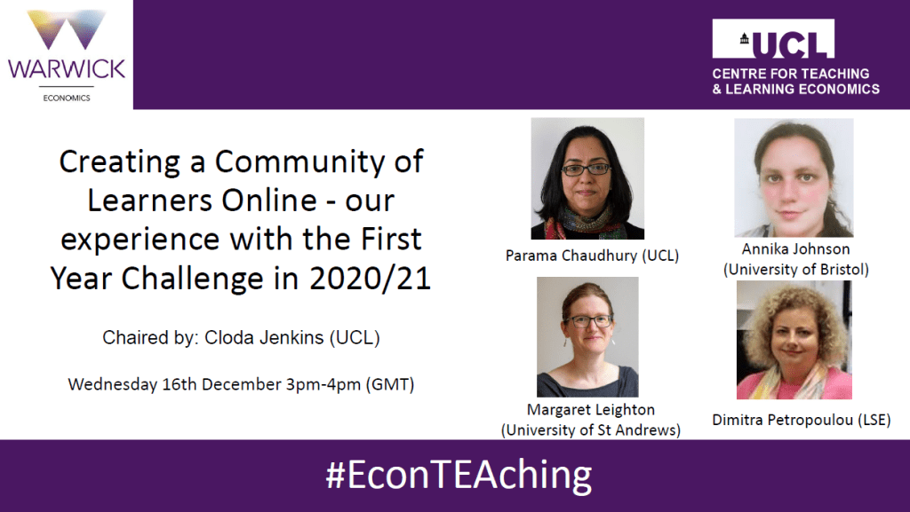 Back in 2015, we introduced the First Year Challenge (FYC), a collaborative student multimedia project, in UCL to create a sense of excitement and community among our freshers upon their arrival to the campus. Soon this project spread to several universities in the UK and around the world. But of course, this September university campuses felt very different; most of us had to start the academic year teaching remotely with most of our students staying outside of campus. One challenge facing us was to adapt the First Year Challenge to this new world of remote/blended teaching. In the 12th session of EconTEAching, Parama Chaudhury (UCL), Annika Johnson (Bristol), Dimitra Petropoulou (LSE) and Margaret Leighton (St Andrews) spoke about their experience of running First Year Challenge in their universities in 2020-2021.