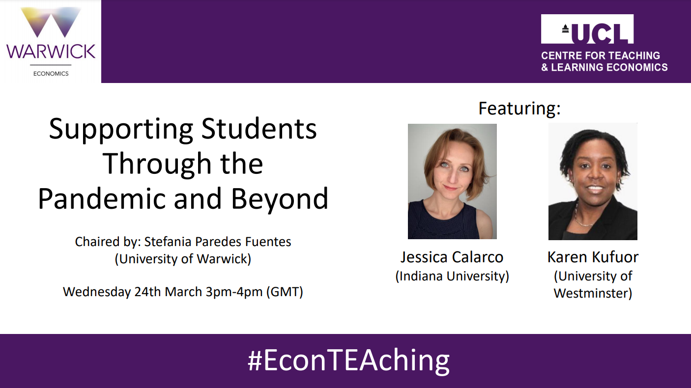 The EconTEAching session on 24th March, 2021 featured Jessica Calarco (Indiana University) and Karen Kufuor (University of Westminster) and was chaired by Stefania Paredes Fuentes (University of Warwick). The livestream from the session can be found on the CTaLE YouTube channel.