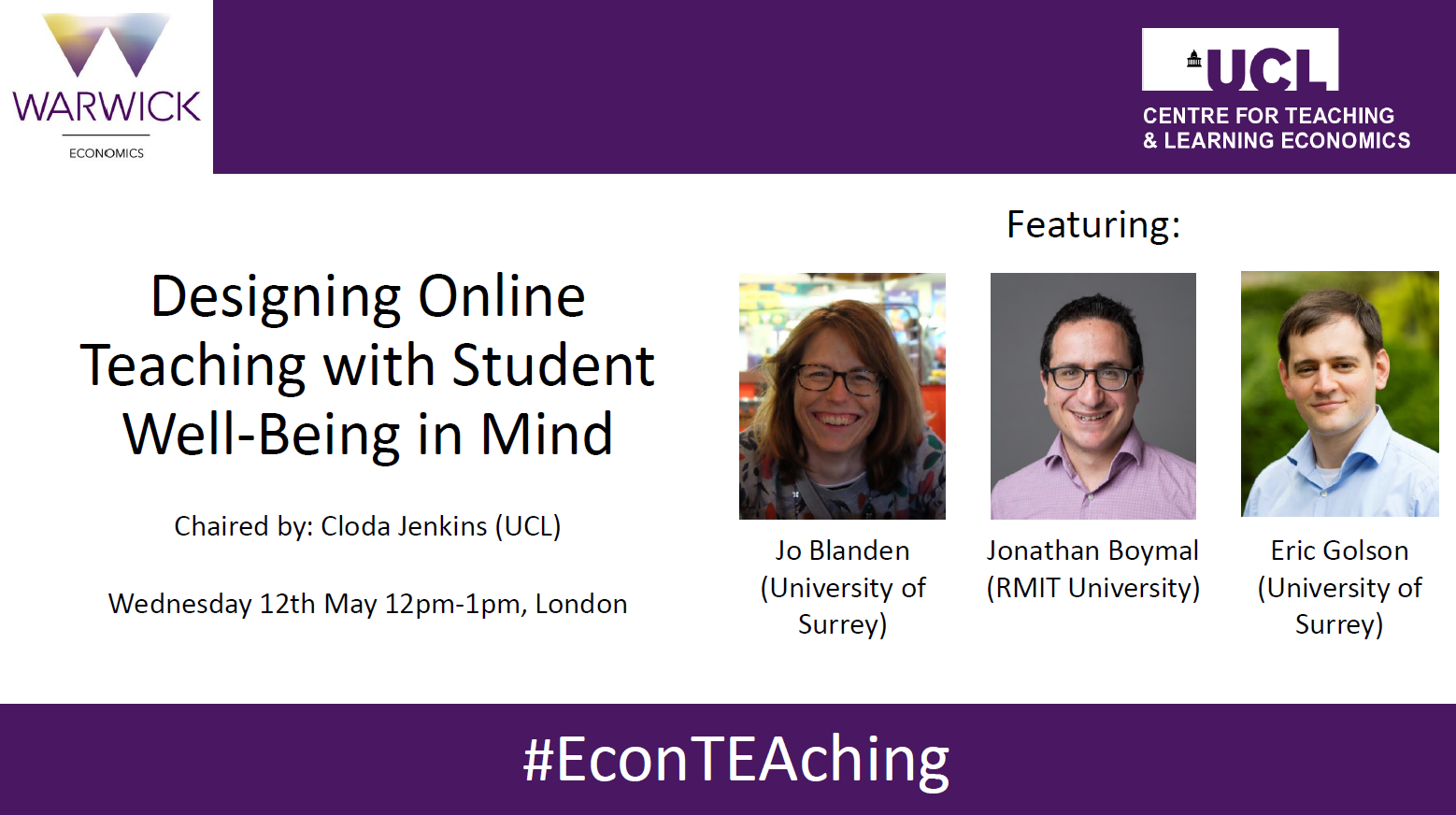 Teaching and learning during a pandemic increased our awareness of the importance of well-being for learning. Learning is facilitated by positive emotions but may be hampered by negative ones, therefore well-being and learning are associated with one another. In this EconTEAching session, Jo Blanden (University of Surrey), Jonathan Boymal (RMIT), and Eric Golson (University of Surrey) shared their ideas and experience on “Teaching with Student Well-Being in Mind”.