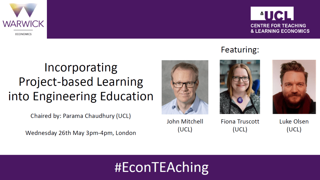 Having reflected on the seminar, it is clear that the approach to project-based learning in the UCL IEP degree has many elements that lend themselves to economics education. Applying economics theory and empirical methodologies to global challenges is what we do as practitioners. Giving students scenarios or big picture questions as consultancy or policy questions provide an excellent opportunity for students to do this within their degree. Establishing big picture projects at programme level, across modules and years, and setting aside concrete time for it is particularly attractive. This allows for lecturers to focus on teaching the concepts and tools and provide the groundwork for projects, whilst allowing students and staff to concentrate their efforts away from the classroom when focused on the projects. There would be work to do, I suspect, identifying how to capture the spread of fields and topics in economics into cross-programme projects but I’m sure the same issue arises in engineering. Alongside the integral learning element of the project work, skills are also developed in team-work, thinking on your feet, project management and time management. All crucial for doing well in a degree and preparing for any future career.