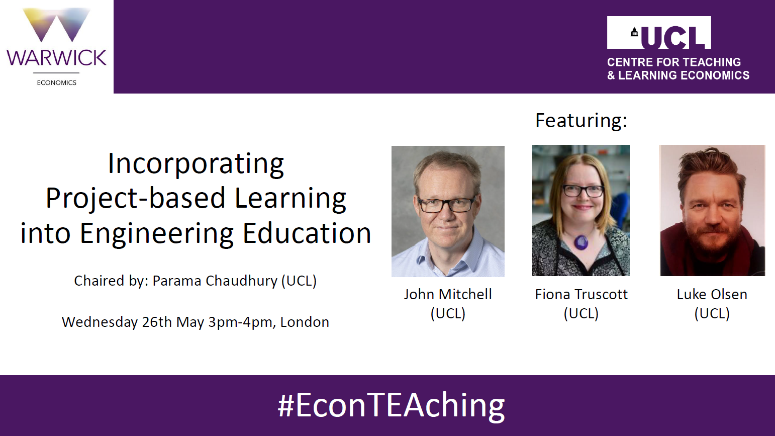 I was really excited to hear that our great colleagues from the award-winning UCL Integrated Engineering Programme were joining us for a cuppa and chat at our 16th EconTEAching seminar on May 26th 2021. I’m not a scientist by any stretch of the imagination but I have spent most of my career, as an advisor in the utilities sector, working on projects with engineers, lawyers and economists. It has always been insightful for me to work across disciplines and I knew we were in for a treat, hearing about how project-based learning approaches are used in engineering. Whilst we might not build bridges, pylons or sewerage treatment plants in economics we certainly work on projects on a daily basis, in teams, inside and outside academic environments. John Mitchell and Fiona Truscott did not let us down, sharing their pedagogy and practical ideas in a way that we can relate to and learn from for our teaching and assessment practice in economics. Much of what they discussed was relevant to campus-based teaching. They did continue the projects they discussed when delivering teaching online in 2020/21, and noted it was tricky but not impossible to replicate the ‘hands-on’ nature of projects.