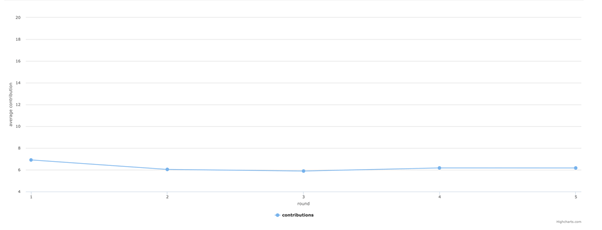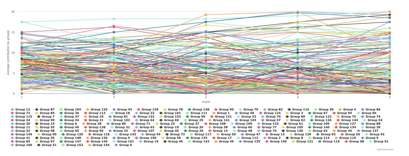 It was great to be able to engage many students in the experiments online. However, the downside to the large group was that there was a lot of noise in the outcomes of the experiments. Average contributions to a public good were easy to see and understand, as illustrated in Figure 1 below for the game with no punishment. However, as Figure 2 shows, there was a lot of noise behind this average value. It was clear that groups were playing the games in different ways. It would have been great to have had time to reflect more with the class on what types of behaviour might be driving different choice pathways, but it was hard to see from the immediate experiment outcomes. Maha, who gives her reflections below, and I have since spent time reviewing the underlying data and will produce a working paper soon examining how the students played. For next year I would like to do this type of analysis shortly after the live session and bring the results back to the students during the term. This would help their learning, particularly around the reasons why players don’t always make choices consistent with theory predictions, even when they know those predictions. This is one of my big takeaways for next year.