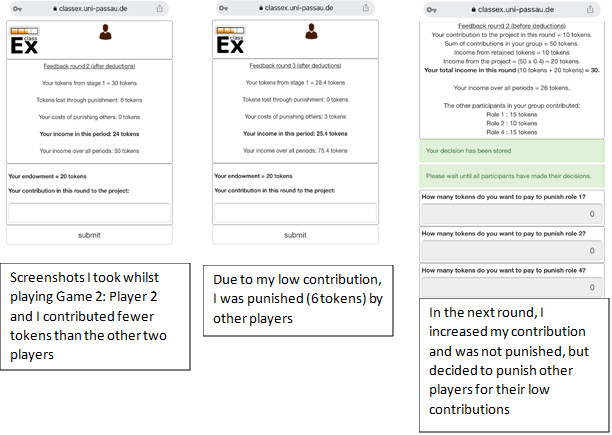 As well as comparing the two games with each other, the Classex experiments also allowed me to think of how these games differ with other concepts I had read about in the textbook. As both games included repeated interactions, members of the group were forced to interact with each other after they had submitted their chosen level of contribution. In the first game (no punishment), this could have led to lower overall contributions. In the game with punishment, players punished others for contributing low amounts, or high levels of punishment, resulting in higher contributions. In comparison, during one-shot games, for example the prisoners’ dilemma, players only interact with each other once, so there is no opportunity to punish other players or react in any way to others’ behaviour. I learnt a lot about how the context of the game being played and its rules matter.
