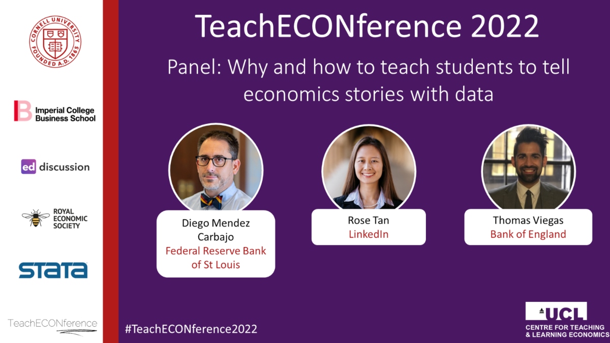 As anthropologist Yuval Noah Harari points out in his seminal book Sapiens, humans are keen on gossip, perhaps to a fault. Nothing captures our attention like a story, to the extent that nearly all popular communication is centred around storytelling, be it the news, music, cinema, video games, or novels. Yet, lost in a slew of datasets, STATA commands, and differential equations, today’s undergraduate economist can be forgiven for concluding that theirs is indeed the “dismal science,” that their job is to perpetually fiddle with the buttons of pricing, policy, or production to ensure the rest of the world can continue having fun. The final seminar at TeachECONference2022 offered a glimmer of hope, with a panel of three speakers from industry sharing their experiences telling stories with data.